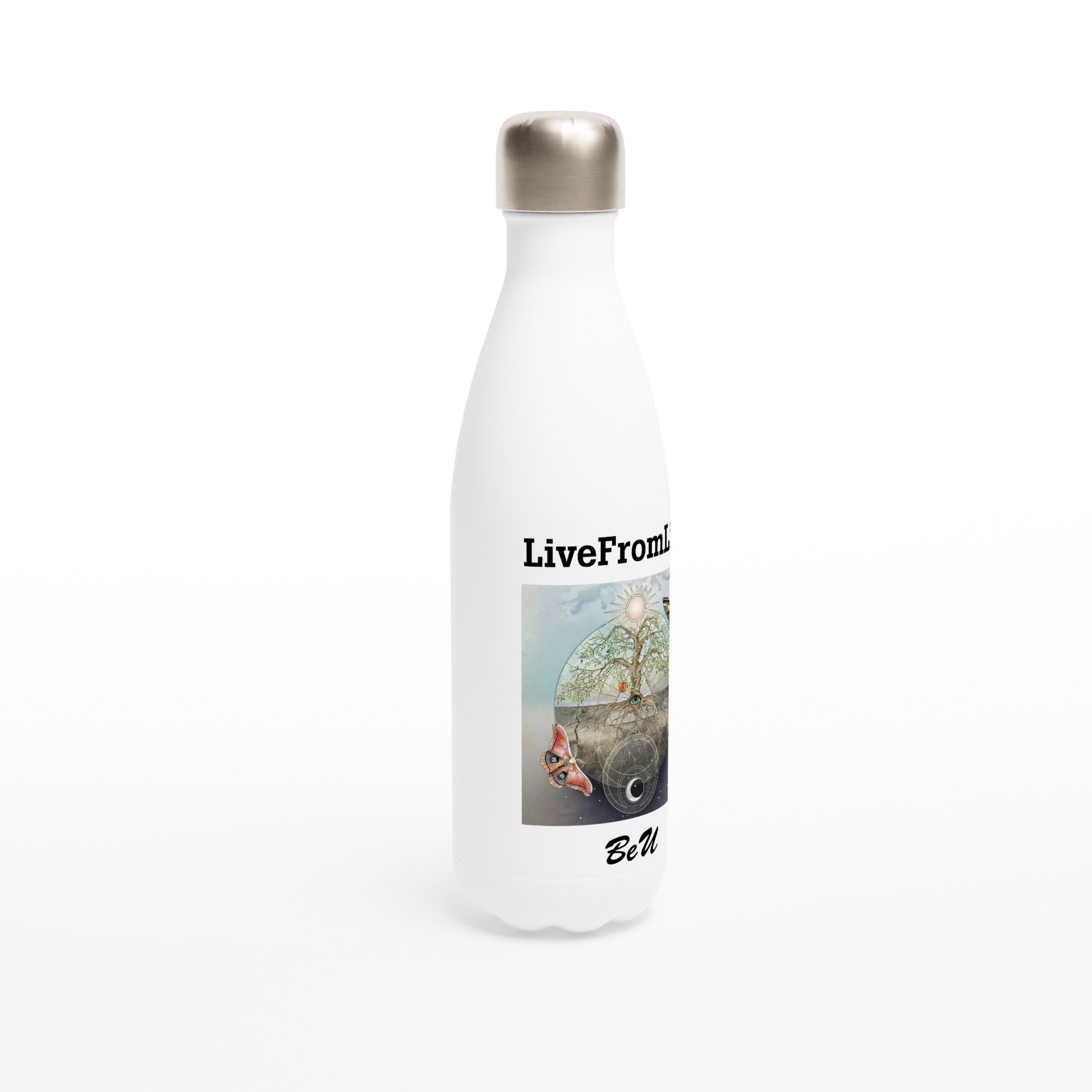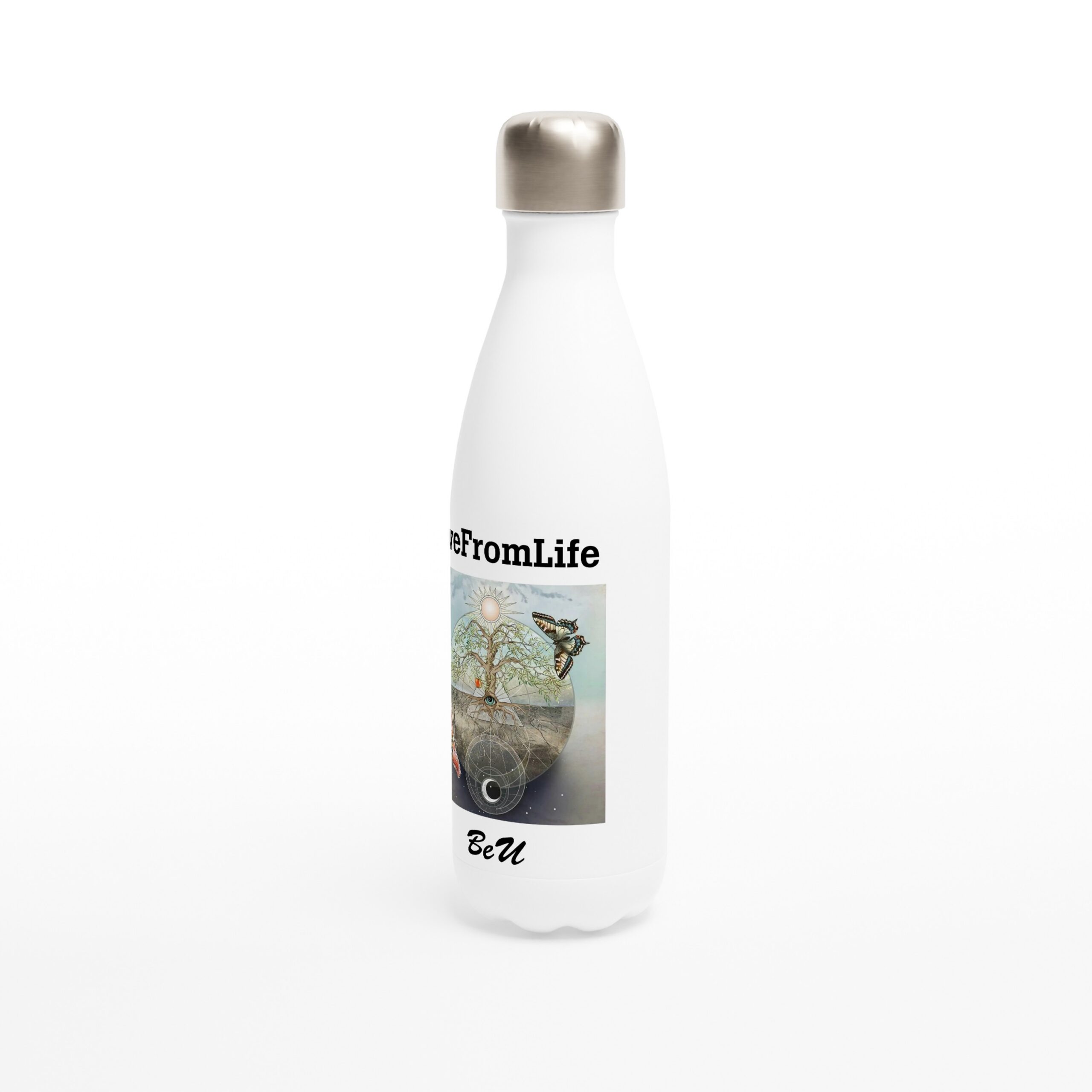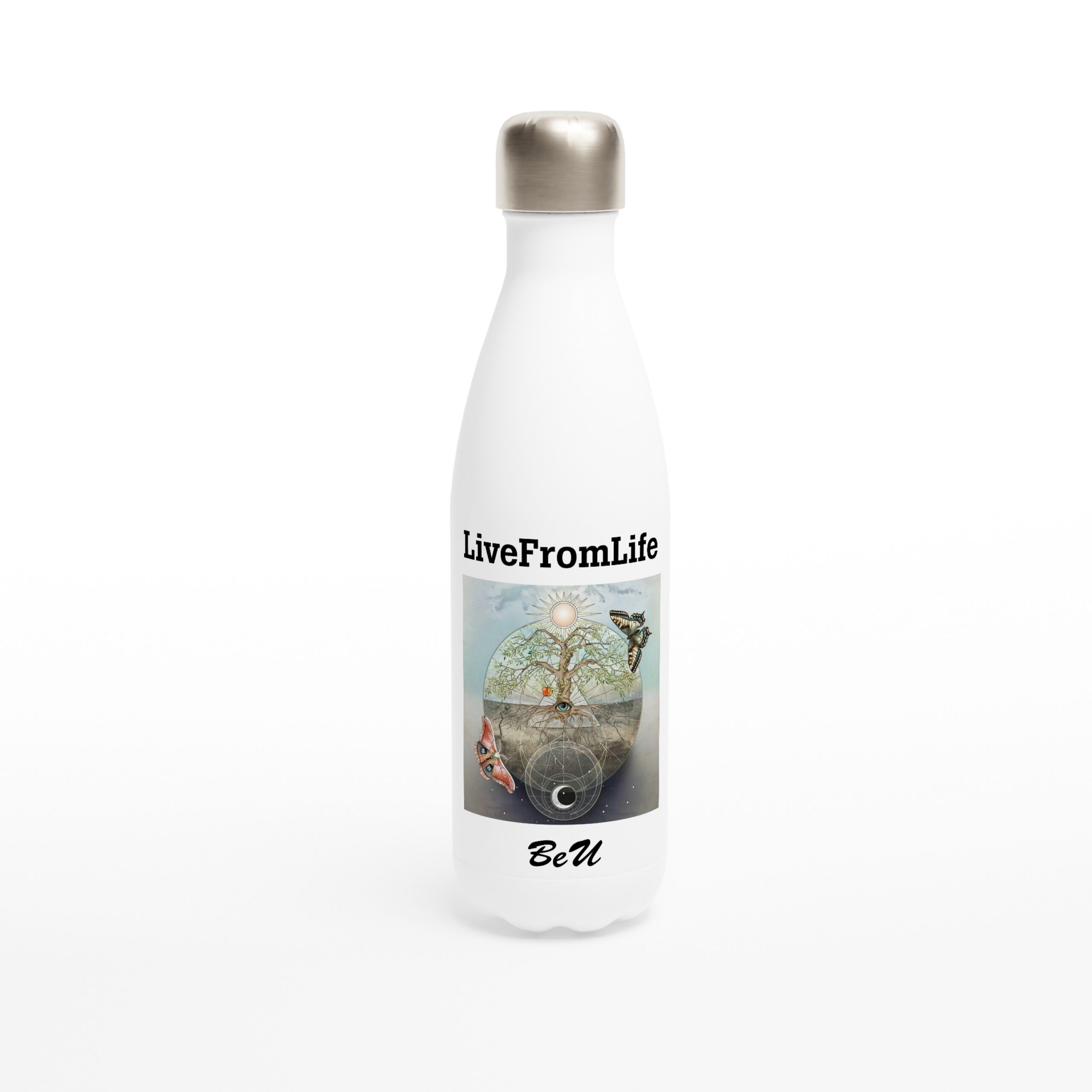 Denne hvite termoflasken er mer enn bare et praktisk tilbehør. Med motivet av sommerfuglen og møllet – symboler på forvandling og det skjulte – minner den deg på å være tro mot deg selv, uansett hvor ferden går.